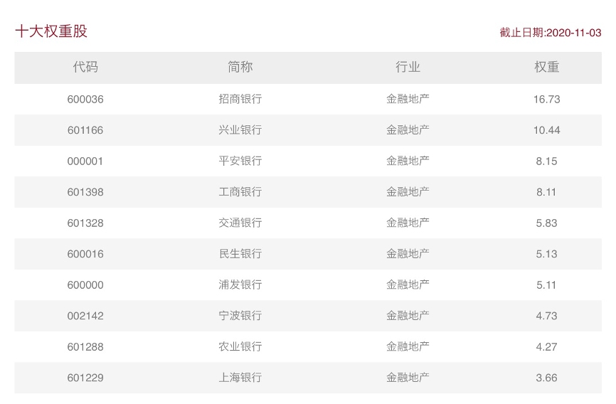 目前中证银行指数的成份股共计36只,清一色全部是银行,包括国有大行(工农建中交)、股份行(招商、兴业、民生等)、城商行(北京、宁波、南京等)、以及农商行(常熟、江银等)。