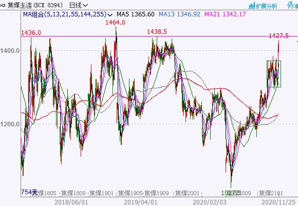 澳煤进口限制不足两个月,蒙古煤炭进口又因疫情加重受限,原本就处于高需求、低库存格局下的焦煤供应更显捉襟见肘。焦煤01合约一举突破前期震荡区间上沿,最高拉升至1427.5元/吨,创去年8月来高位,回补当时主力换月留下的缺口。目前焦煤期价仍处上升趋势,能否有望再下一城,站上大周期阻力位?