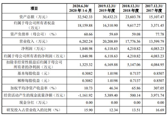 招股书披露,2017年至2020年上半年,森根科技实现营业收入分别为13,599.79万元、17,776.36万元、20,208.89万元和6202.24万元,净利润分别为4083.23万元、4210.82万元、6118.63万元和1848.98万元。