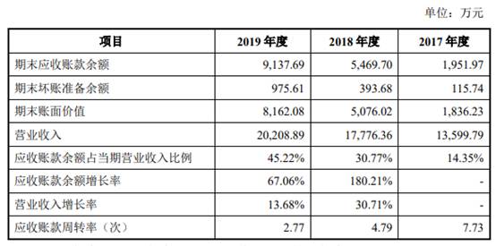 2017年末至2019年各期末,森根科技的逾期应收账款余额分别为535.27万元、3023.13万元和5378.45万元,大幅增加,同期的应收账款坏账准备余额分别为115.74万元、393.68万元和975.61万元。