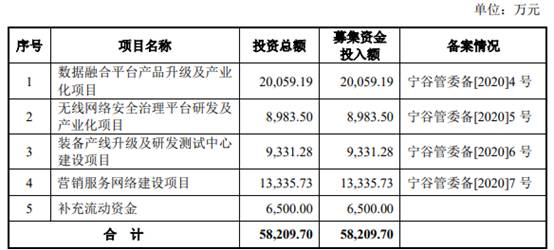 公司计划使用募集资金2.01亿元用于“数据融合平台产品升级及产业化项目”、8983.50万元用于“无线网络安全治理平台研发及产业化项目”、9331.28万元用于“装备产线升级及研发测试中心建设项目”、1.33亿元用于“营销服务网络建设项目”、6500万元用于“补充流动资金”。