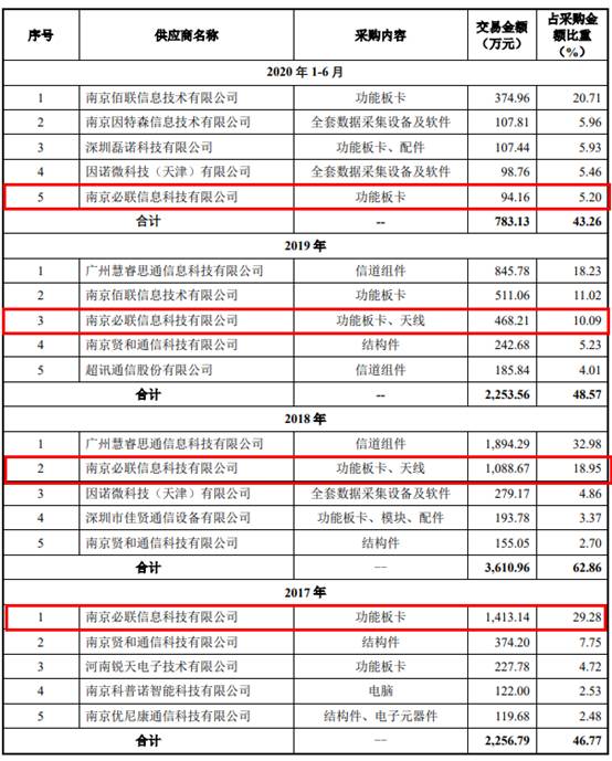 此外,公司在2017年的另外两大主要供应商南京科普诺智能科技有限公司(下称“科普诺智能”)、南京优尼康通信科技有限公司(下称“优尼康”),之后再未出现在公司的前五大供应商名单之中。
