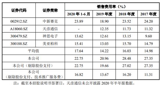2017年末、2018年末、2019年末和2020年6月末,同行业可比公司的销售费用率均值分别为14.98%、16.03%、14.22%和17.64%,均低于森根科技。