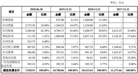 公司的流动负债主要由应付票据、应付账款等组成。2018年末、2019年末和2020年6月末,公司应付票据余额分别为1210.04万元、1560.32万元和2773.39万元,均为已开具尚未兑付的银行承兑汇票。
