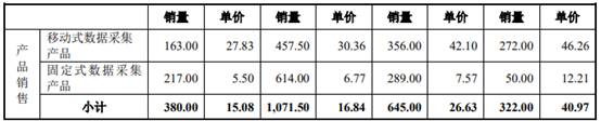 但作为公司最主要的两类产品,销售价格却一再下降。上述同期,移动式数据采集产品单位价格分别为46.26万元/套、42.10万元/套、30.36万元/套和27.83万元/套,固定式数据采集产品单位价格分别为12.21万元/套、7.57万元/套、6.77万元/套和5.50万元/套。