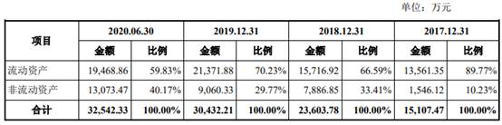 2017年末、2018年末、2019年末和2020年6月末,森根科技的资产总额分别为15,107.47万元、23,603.78万元、30,432.21万元和32,542.33万元,其中流动资产占总资产的比重分别为89.77%、66.59%、70.23%和59.83%。