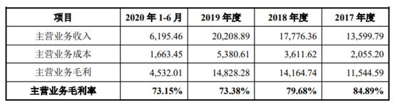 2017年至2020年上半年,森根科技的主营业务毛利率分别为84.89%、79.68%、73.38%和73.15%,呈现逐年下降的趋势。