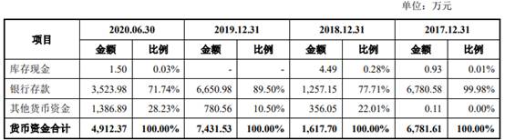 2017年末、2018年末、2019年末和2020年6月末,公司货币资金余额分别为6781.61万元、1617.70万元、7431.53万元和4912.37万元,其中银行存款分别为6780.58万元、1257.15万元、6650.98万元和3523.98万元。