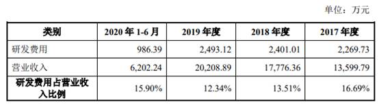 2017年末、2018年末、2019年末和2020年6月末,森根科技的研发费用分别为2269.73万元、2401.01万元、2493.12万元和986.39万元,占营业收入的比例分别为16.69%、13.51%、12.34%和15.90%。