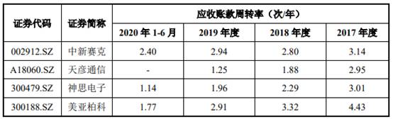 2017年末至2020年6月末,森根科技的应收账款周转率分别为7.73、4.79、2.77和1.33,同行业可比公司的应收账款周转率均值分别为3.38、2.57、2.26和1.77。