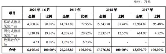 2017年、2018年、2019年和2020年1-6月,森根科技销售的移动式数据采集产品占营业收入比例分别为95.48%、87.44%、72.95%和80.07%,固定式数据采集产品占营业收入比例分别为4.52%、12.56%、20.82%和19.86%。