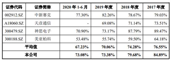 2017年至2020年上半年,同行业可比公司的毛利率均值分别为76.55%、74.28%、70.06%和67.23%。