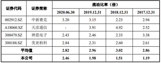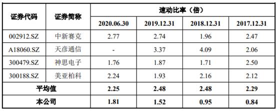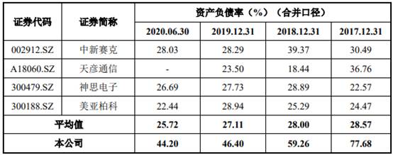 上述同期,同行业可比公司的资产负债率均值分别为28.57%、28.00%、27.11%和25.72%,流动比率均值分别为2.86、3.02、2.96和2.82,速动比率均值分别为2.29、2.48、2.48和2.25。