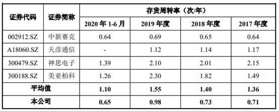 2017年末至2020年6月末,森根科技的存货周转率分别为0.71、0.73、0.98和0.65,同行业可比公司的存货周转率均值分别为1.36、1.40、1.55和1.10。