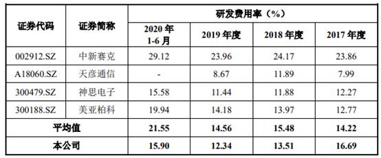 2017年末、2018年末、2019年末和2020年6月末,同行业可比公司的研发费用率均值分别为14.22%、15.48%、14.56%和21.55%,略高于森根科技。