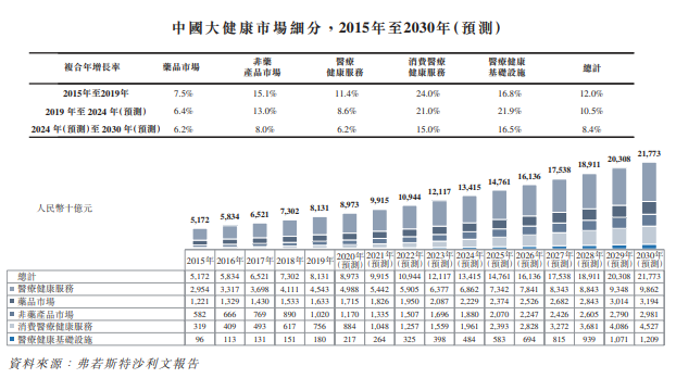 根据弗若斯特沙利文报告,2019年中国大健康行业的市场规模达到人民币8.13万亿元,预计2030年将增至人民币21.77万亿元,复合年增长率为9.4%。