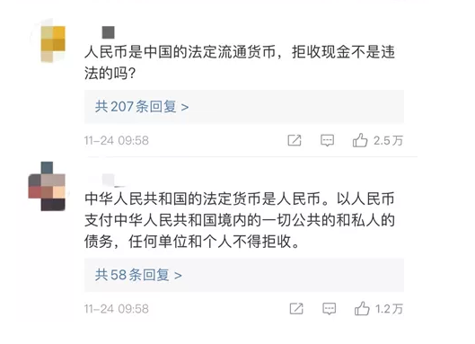一时间,“拒收现金”的话题被提到风口浪尖。从新闻里的视频中可以看到,年迈的老奶奶冒着大雨前往社区办理业务时却被工作人员告知,“不收现金,要么告诉亲戚,要么你自己在手机上支付,就这两个方式。”听到这个回答,老人显得有些不知所措,神情落寞地独自坐在椅子上。该新闻一出,引起了网友的广泛热议,有人为老人打抱不平,有人立马评论道“拒收现金是违法的”。