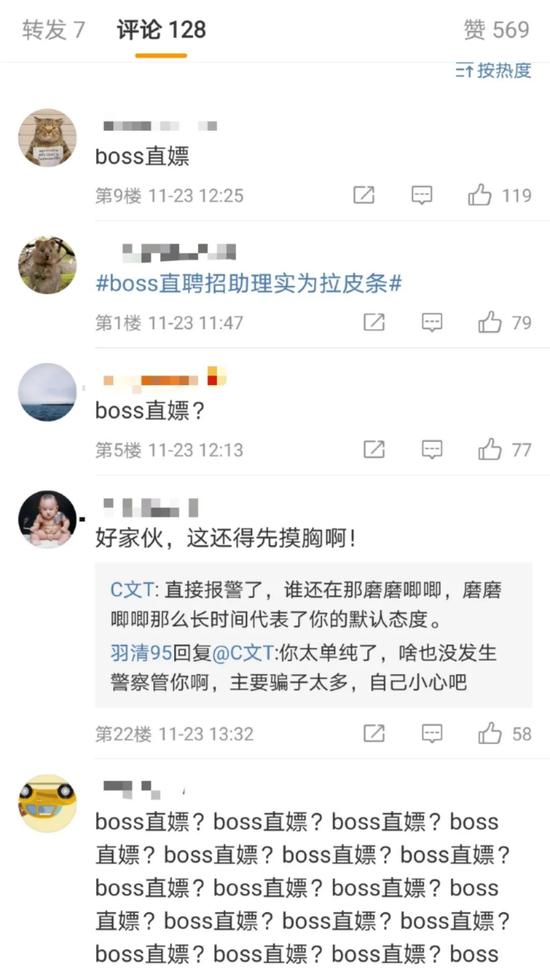 “我最近都在找工作,通过BOSS直聘加到的他……他说八千一个月,让我做他的女朋友跟秘书,”微博女网友艳艳在今年5月份发帖表示,其在通过BOSS直聘寻找“秘书助理”一职时,遇到了情色招聘。