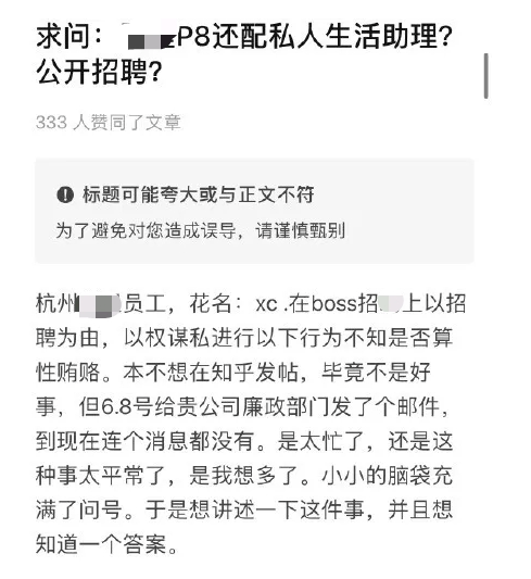 今年6月,有知乎网友爆料称,某杭州知名公司高级员工在BOSS直聘上公开招聘生活助理,要求应聘者提供性服务,并开出每月1.6万元的包养费。事件曝光后,该公司另一员工表示,经过公司廉政部门调查,确认网上所传聊天记录属实,公司根据管理规定,对其做出了辞退处理。