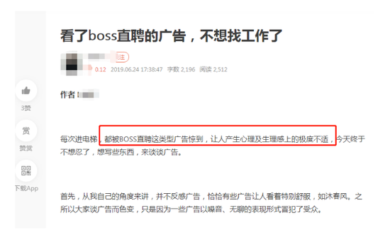 从营销效果来看,这句广告语让用户对BOSS直聘的直聊功能印象深刻,但另一方面,简单粗暴的口号很容易引起用户的反感,甚至有网友表示对该广告产生了生理不适。人民日报曾发文批评称,这类广告无创意、无美感、无内涵,带给观众的不是愉悦而是折磨,不是美妙而是痛苦。