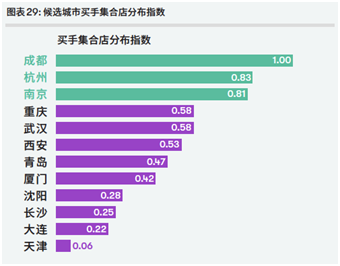 在数量上看,成都和杭州拥有最多的买手店门店数量。报告分析,这说明两座城市能够满足年轻人的探索欲和好奇心,证明个性,也表现出城市发达的经济水平和超前的消费观念。