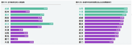 与之相比,沈阳、大连在居民人均时尚消费支出以及时尚消费占比等实际体现购买力的维度上位列前茅,与寒冷气候导致人们对于单价较高的服饰、鞋履产品的需求更高密切相关。