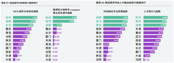 一个例子是,直播与短视频行业的发酵,推动更多关注时尚、参与时尚产业的年轻人向直播产业发达的城市聚集。根据报告调研,在MCN分布、微博百大视频号博主数量最多的杭州,时尚人才吸引力也排名首位。