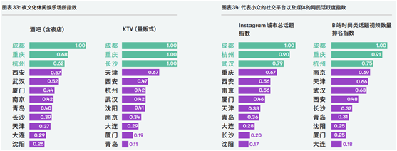 比如,作为电音发展的“主阵地”,酒吧和夜店指数排名前三分别是成都、重庆和杭州,这恰与城市的电音文化领导力排名相一致。成都、重庆和杭州也分别占据小众文化社群所在的instagram和b站城市与时尚话题前两位。