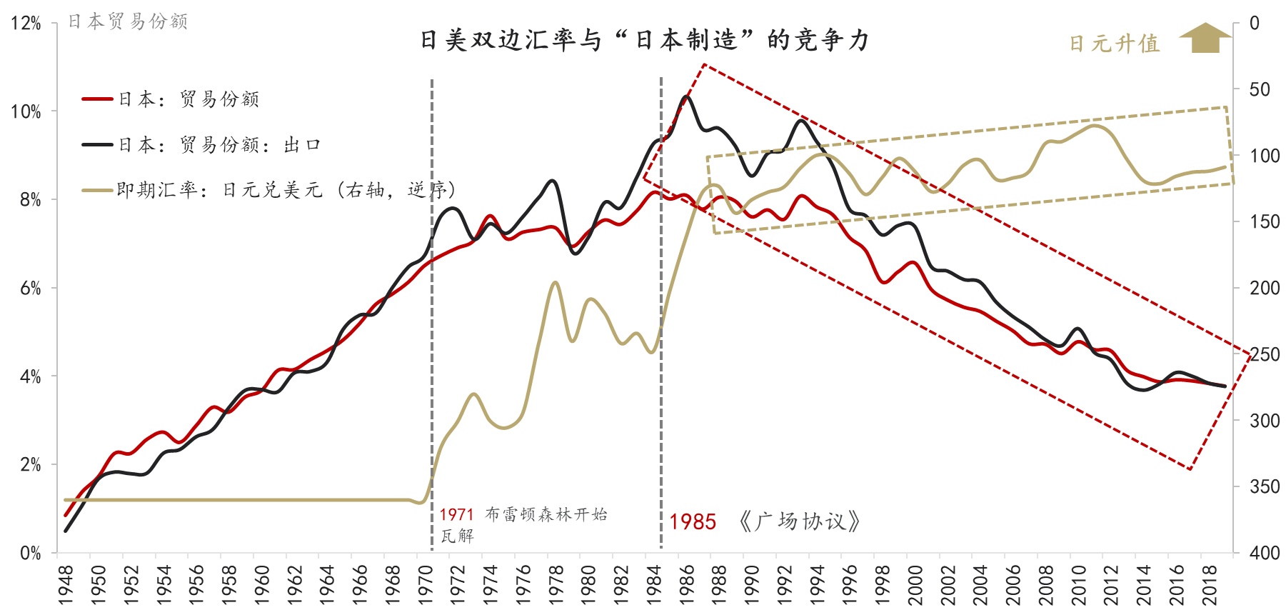 日本的经验可以更明确地体现出汇率对于贸易的重要性。据都留重人介绍,1949年4月23日确定的日元兑美元汇率——1美元等于360日元——是由道奇决定的,这“过分低估了日元”(都留重人,《日本奇迹的终结》,p.60-61),它也被证明是日本获取价格性竞争力的工具(林德拉,2012)。1971年之后,日元在1971-1973年、1975-1978年和1985-1987年三个时间段快速升值,90年代初开始升值速度放缓。1985年《广场协议》是重要拐点,日本占世界贸易的份额在此前不断上升。贸易顺差绝对值也在1986年达到顶峰,之后连续4年下降,至1990年,降幅接近40%(图2)。