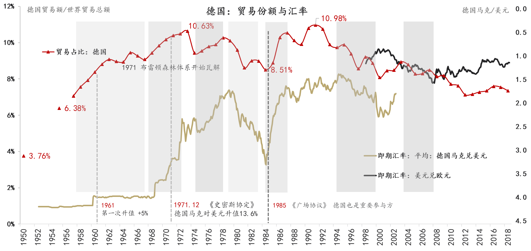 马克汇率的波动与德国的世界贸易份额的关系并不明确,有显著的时变特征。上世纪60年代末之前,马克汇率低估显然是德国获取价格性竞争力的原因之一。70年代至80年代末,马克汇率与贸易份额同涨同落,但由于滞后效应的存在,两者表面上的正相关,很可能是负相关;90年代初至今,德国贸易份额缓慢下行,而马克汇率在90年代上半期基本稳定,后半期持续贬值。即使不是最主要的因素,也必须得承认,马克升值仍然给德国出口贸易部门带来了不小的压力。
