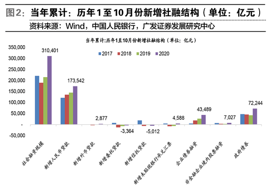 10月,国债继续放量支撑社融高增长。10月,政府债净融资4931亿元,比2019年同期增加3060亿元,是支撑社融高增长的主要原因。展望11月、12月,中央政府加杠杆将对社融增长形成支撑,地方政府专项债基本在10月底发行完毕。全年政府债净增加额度8.5万亿元(中央财政赤字2.78万亿元+特别国债1万亿元+地方财政赤字9800亿元+地方债3.75万亿元),一至三季度,国债净增加2.47万亿元,比2019年同期增长1.47万亿元,四季度仍有1.3万亿元净增加规模,比2019年四季度增长5600亿元,月均新增4000亿元左右。