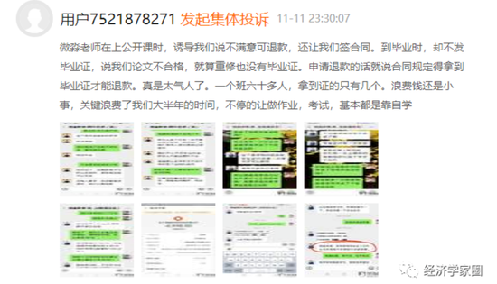 他们醒悟后发现申请退费比登天还难,于是黑猫投诉平台上“违规荐股、退费困难”“诱导学员利用贷款分期付费”“虚假宣传”的投诉有170多条,微淼商学院并未给过正面回应。