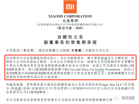 不过,上次减持3.5亿股后,小米紧急发布禁售期承诺,根据小米发布的自愿性公告得知,林斌剩余股份会锁定五年。即自9月15日起五年内,林斌及其控制实体均不会再出售股份,此前已安排捐赠给家族慈善基金的1.2亿股B类股除外。