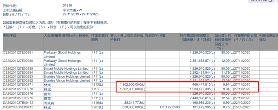 2019年8月,港交所披露易显示,林斌连续三日卖出小米股份,8月21日以9.0731港元卖出2670万股公司股票;8月22日卖出555.96万股,8月23日卖出904.76万股,三日共计卖出4130.72万股,套现大约3.7亿港元。