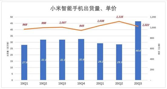 2020年Q2小米智能手机售出2830万部,受疫情影响出货量同比减少380万部;三季度手机出货4660万部,同比增加45.3%,比二季度多卖1830万部。2020年Q3智能机ASP为每部1022元,较2019年Q3上升15元,但比2020年Q2低94元。