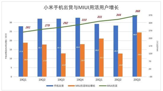 2020年Q3,小米卖出4660万部手机,9月份MIUI活跃用户达到3.68亿,环比增长2450万。
