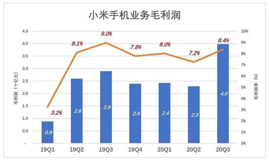 2020年Q3,手机业务毛利润达39.8亿,贡献率39%、反超互联网服务。如果这种格局能够持续,意味着小米进入新的发展阶段。