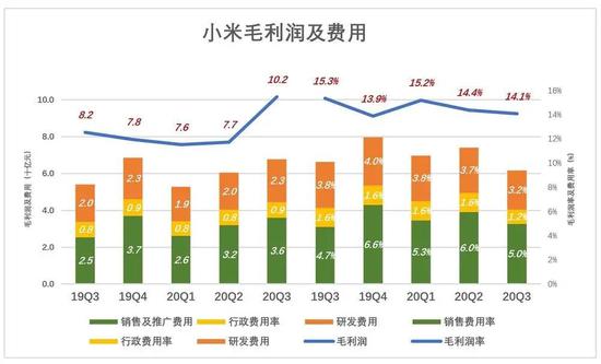 鉴于众所周知的价格政策,小米毛利润率比较低,只有在费用控制方面下功夫。2020年Q2,毛利润、毛利润率分别为77亿、14.4%;销售及推广费用、费用率分别为32亿和6%。2020年Q3,毛利润、毛利润率分别为102亿、14.1%;销售及推广费用、费用率分别为36亿和5%。