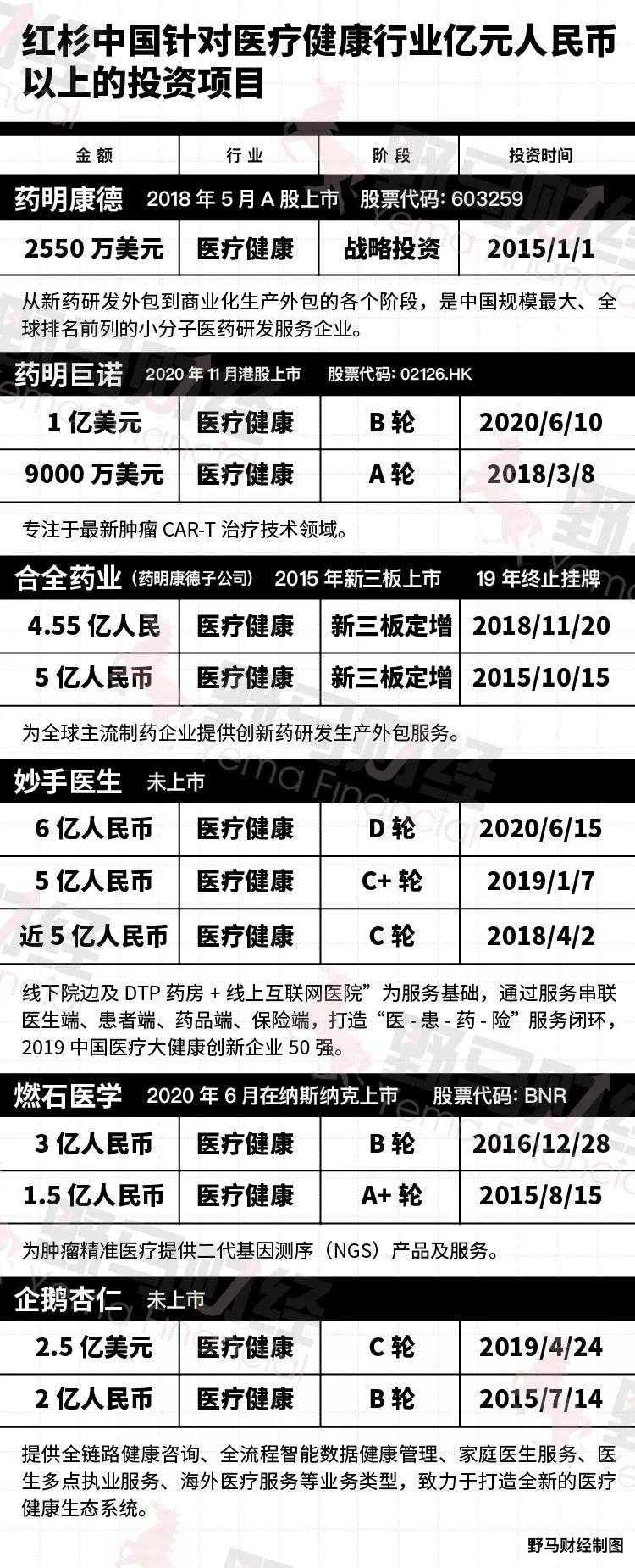 2018年到2020年间,共对其投资近16亿元,对为肿瘤精准医疗提供二代基因测序(NGS)产品及服务的燃石医学投资4.5亿元,且该企业已在2020年6月登陆纳斯达克,发行价达到16.5美元/股。