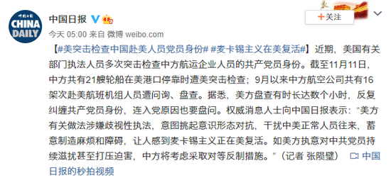 近期,美国有关部门执法人员多次突击检查中方航运企业人员的共产党员身份。截至11月11日,中方共有21艘轮船在美港口停靠时遭美突击检查;9月以来中方航空公司共有16架次赴美航班机组人员遭问询、盘查。据悉,美方盘查有时长达数个小时,反复纠缠共产党员身份,连入党原因也要盘问。权威消息人士向中国日报表示:“美方有关做法涉嫌歧视性执法,意图挑起意识形态对抗,干扰中美正常人员往来,蓄意制造麻烦和障碍,让人感到麦卡锡主义正在美复活。如美方执意对中共党员持续滋扰甚至打压迫害,中方将考虑采取对等反制措施。”(记者 张陨璧)