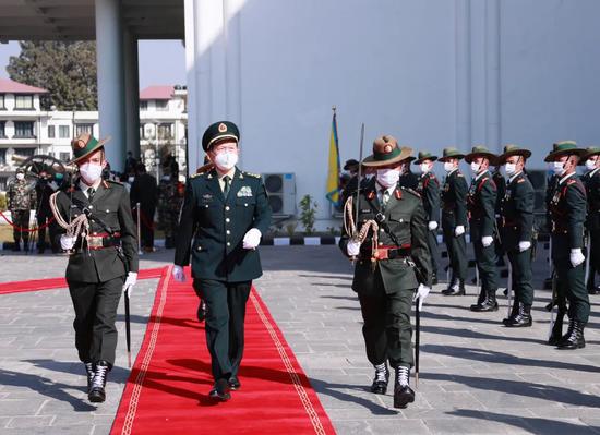 11月29日下午,正在尼泊尔访问的中国国务委员兼国防部长魏凤和检阅尼军仪仗队。李晓伟摄