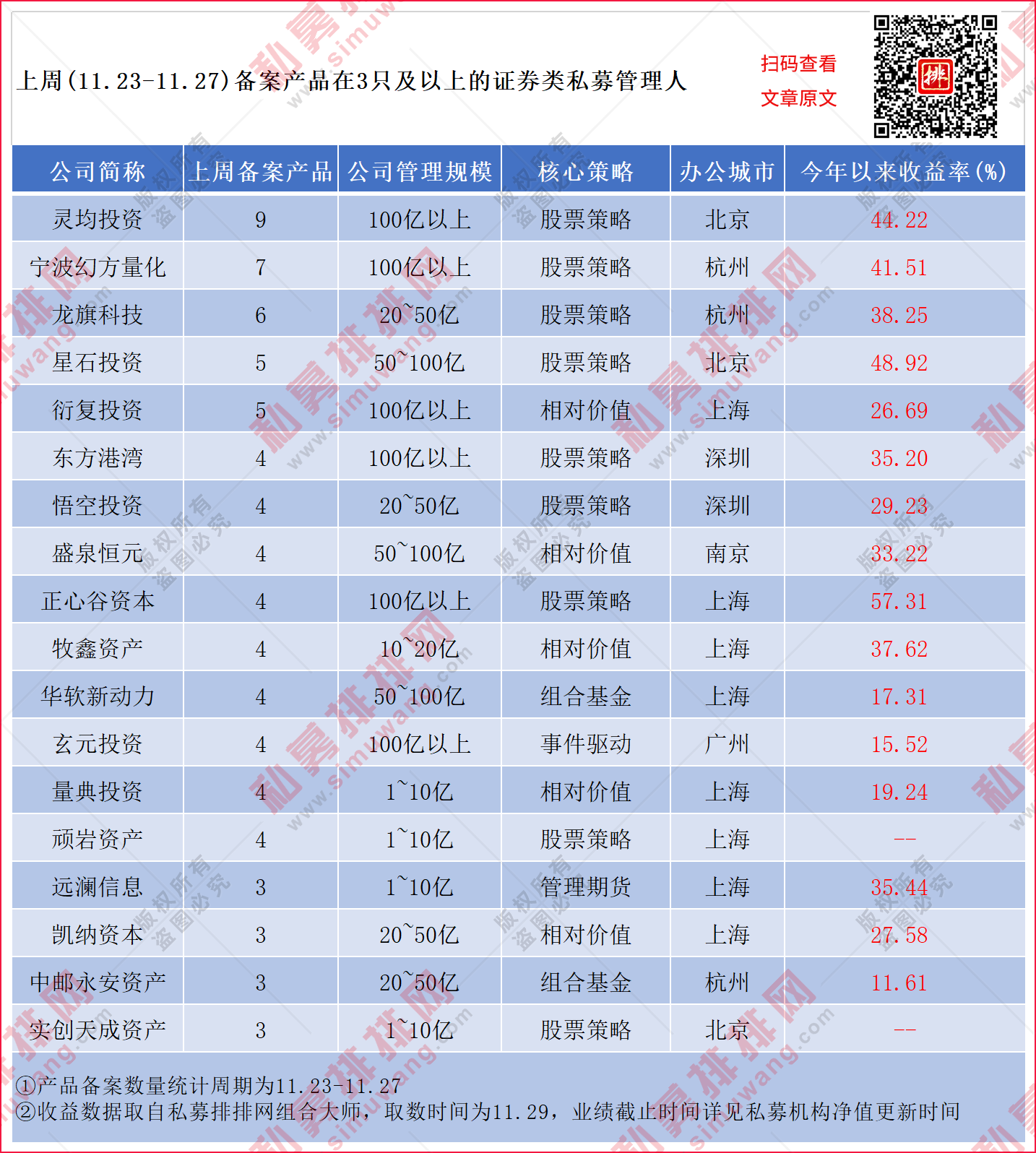 根据私募排排网不完全统计,上周(11.23-11.27)共有598只私募产品完成备案登记。其中317家证券私募管理人共计备案产品420只,在新增备案产品中占比70.23%。有59家私募至少备案了2只及2只以上产品,18家私募单周备案基金数量超过3只。
