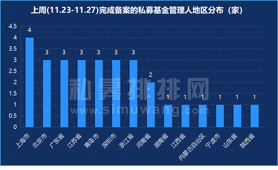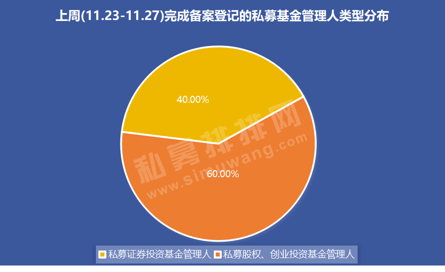 根据私募排排网不完全统计,上周(11.23-11.27)新增备案私募管理人共计30家,较上周增加3家。其中,私募股权、创业投资基金管理人18家,占比60%;上周新增私募证券投资基金管理人12家,占比40%。
