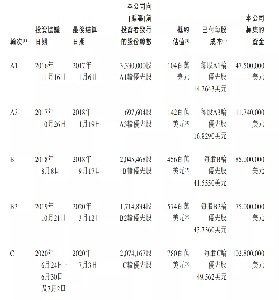 2020年7月9日,公司完成上市前最后一轮融资1.028亿美元C轮融资,由Hudson Bay Capital领投,OrbiMed(奥博资本)、碧桂园创投等参与,C轮公司估值约7.8亿美元(约60亿港元),此次招股区间89.8~99.2亿港币港币,按招股中位数94亿计算,4个月估值涨幅56%。