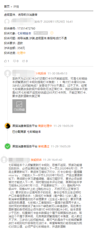 记者注意到,自今年2月份以来,黑猫投诉和聚投诉等第三方投诉平台上关于“七彩熊绘本”APP的投诉帖数量激增。据不完全统计,截至11月30日上午,上述2个平台的投诉帖数量已超200个,投诉内容大多涉及“打卡完成不予返现”、“虚假宣传”等。