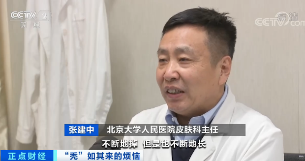 北京大学人民医院皮肤科主任 张建中:每个人有80%-90%的头发处于生长期,另外有5%到10%的头发处于休止期,休止期的头发就会慢慢脱落。脱落的头发下方,又有一个新的毛囊生成,所以我经常和患者说,我们的头发像韭菜一样,不断地掉,但是也不断地长。