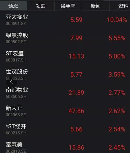 同时,领涨股亚太实业涨停,绿景控股、ST宏盛涨超5%。
