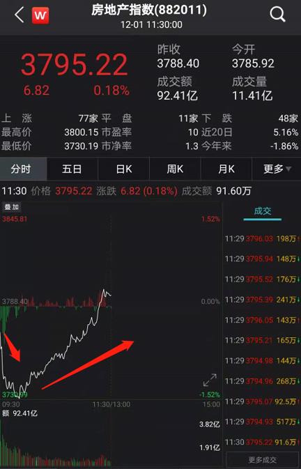 当天上午,房地产板块成交近百亿,飘红房地产股超77家。