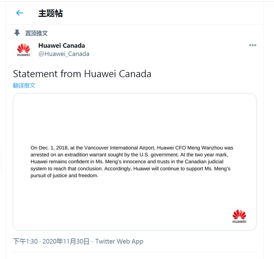 2020年11月30日,华为加拿大公司通过社交网络平台发布简短声明。