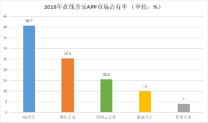 据Quest mobile数据,2018年QQ音乐的市占率达到了40.7%位列首位,酷狗、网易云音乐和酷我音乐的市占率分别为25.4%、15.6%和10%,而虾米音乐仅为4%。